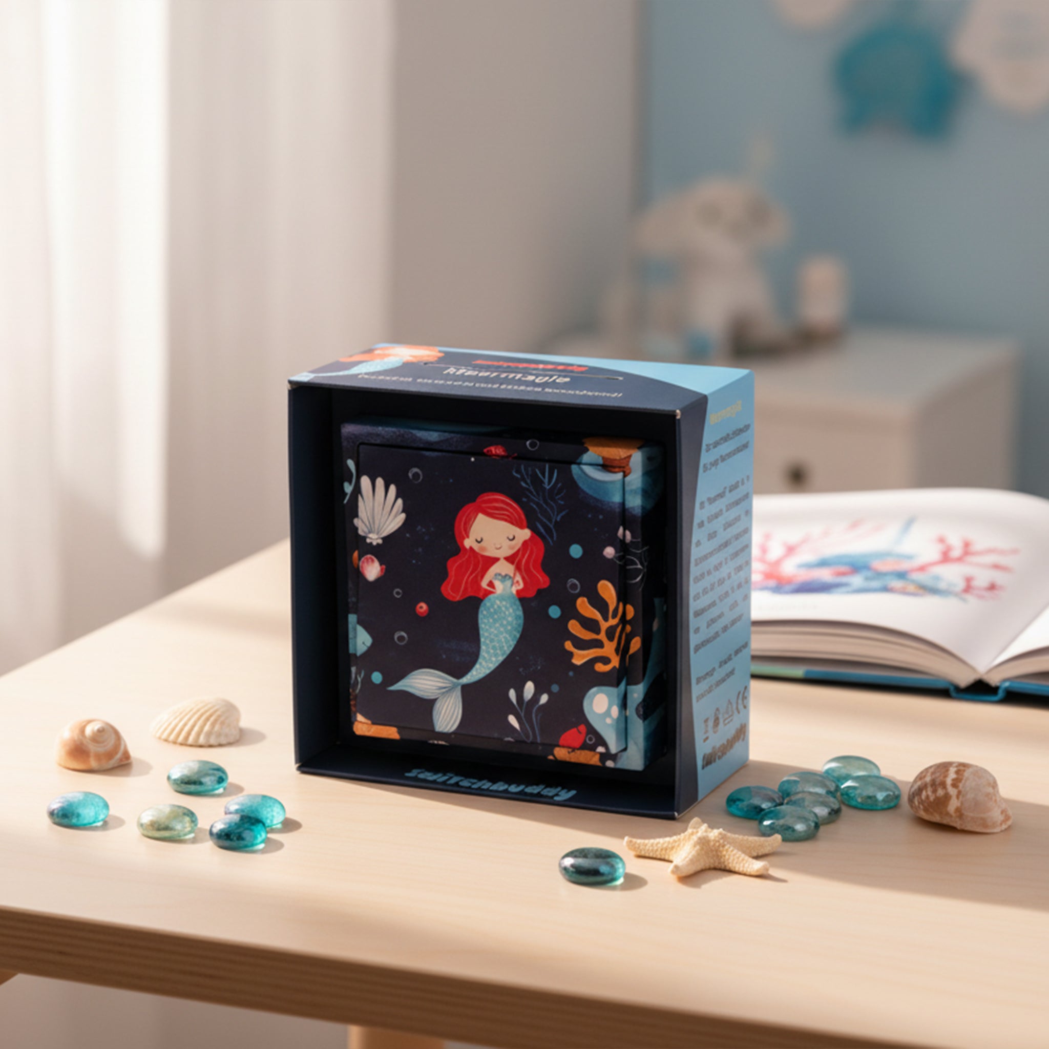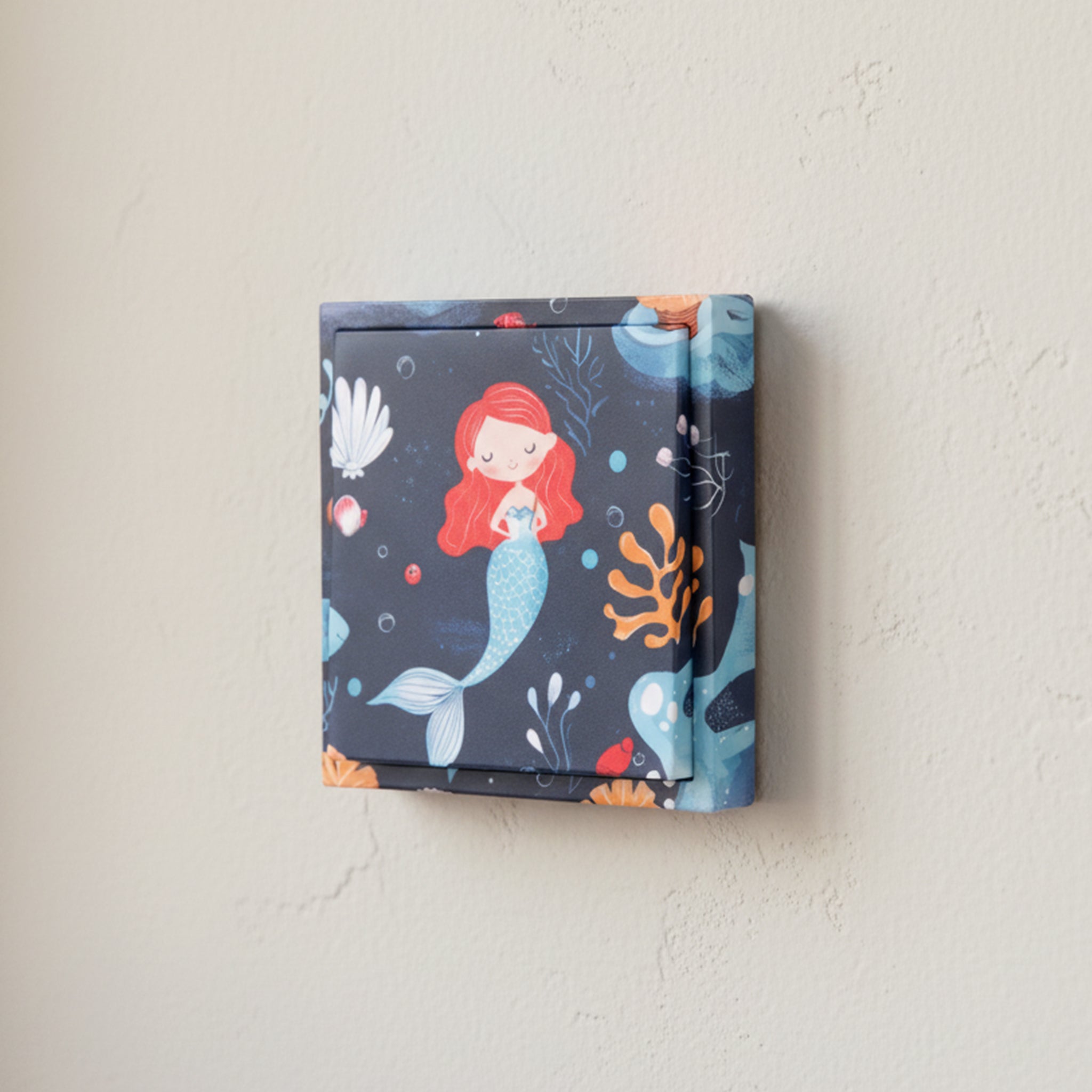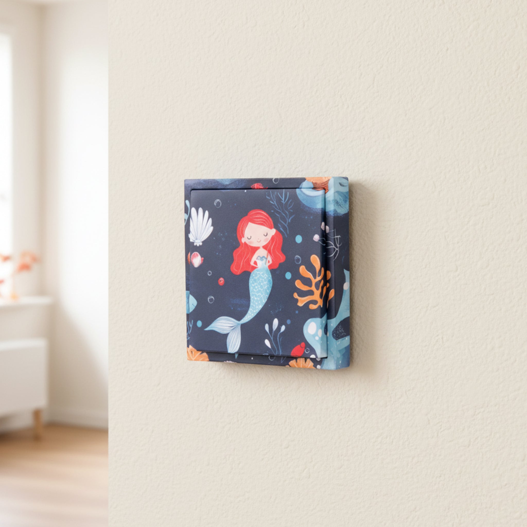 Mit "Meermagie" tauchst du in eine funkelnde Unterwasserwelt ein. Dieser Lichtschalter im Unterwasserzauberlook holt die Magie der Tiefsee ins Kinderzimmer. Perfekt für alle, die von glitzernden Wellen und geheimnisvollen Tiefen träumen!
