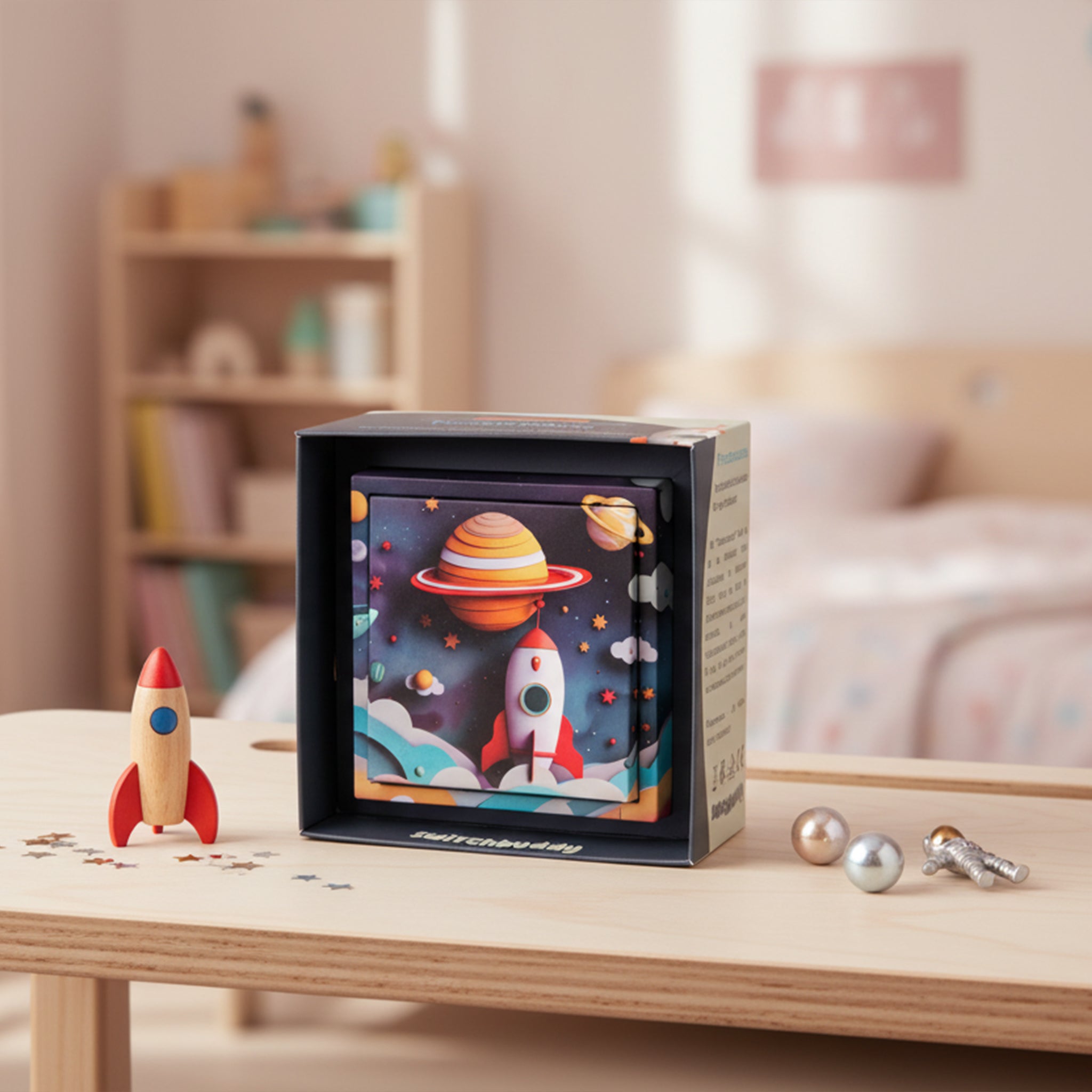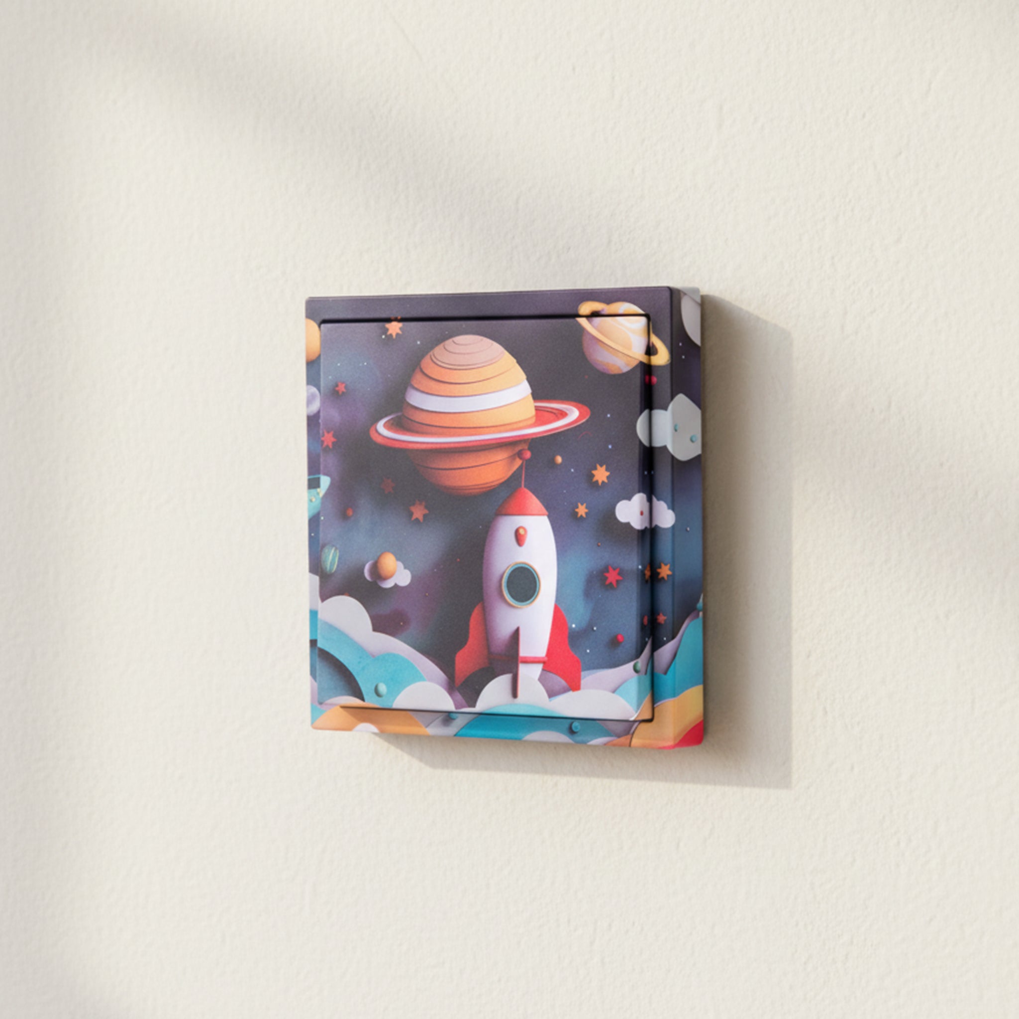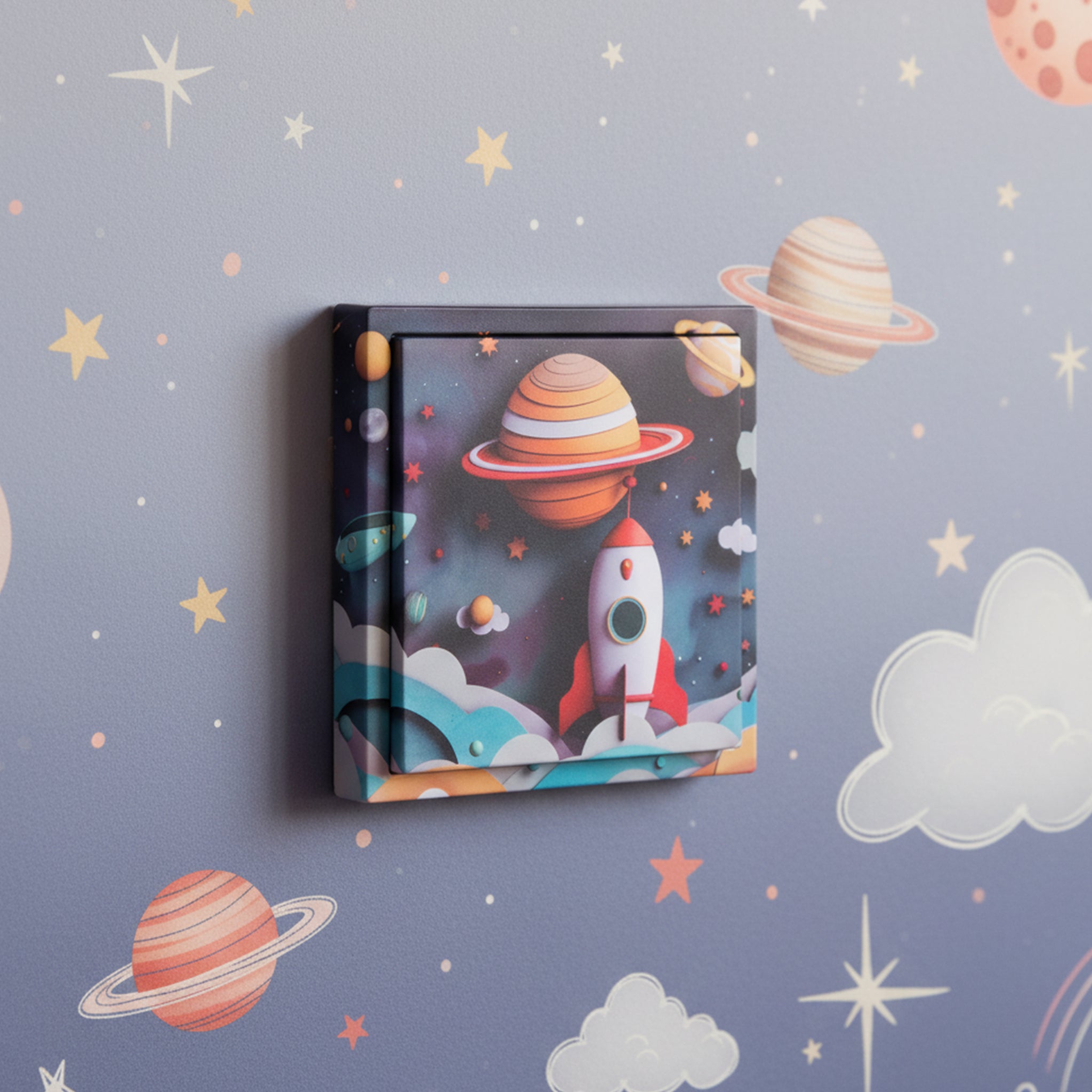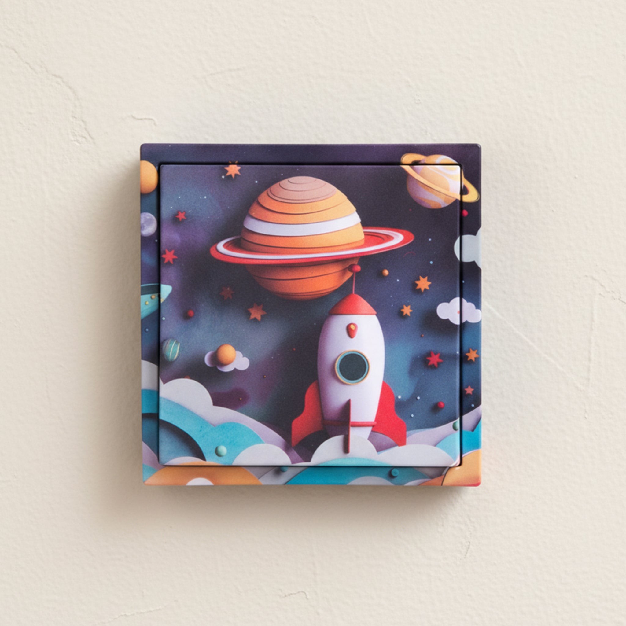 Mit "Planetensause" hebst du ab ins Abenteuer! Dieser Lichtschalter im kosmischen Design bringt das Weltall ins Kinderzimmer und macht das Licht einschalten zu einem intergalaktischen Erlebnis. Perfekt für alle, die von fernen Planeten und funkelnden Sternen träumen!